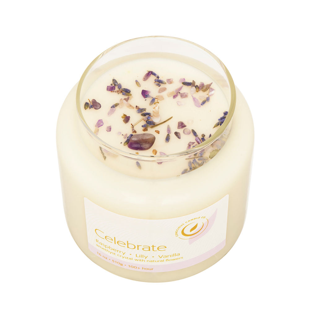 Celebrate life’s sweetest moments with this indulgent candle, blending vibrant Raspberry, fresh Lilly, and creamy Vanilla. Topped with Amethyst crystals and natural flowers, this Conscious candle fills your space with a joyful aromas.